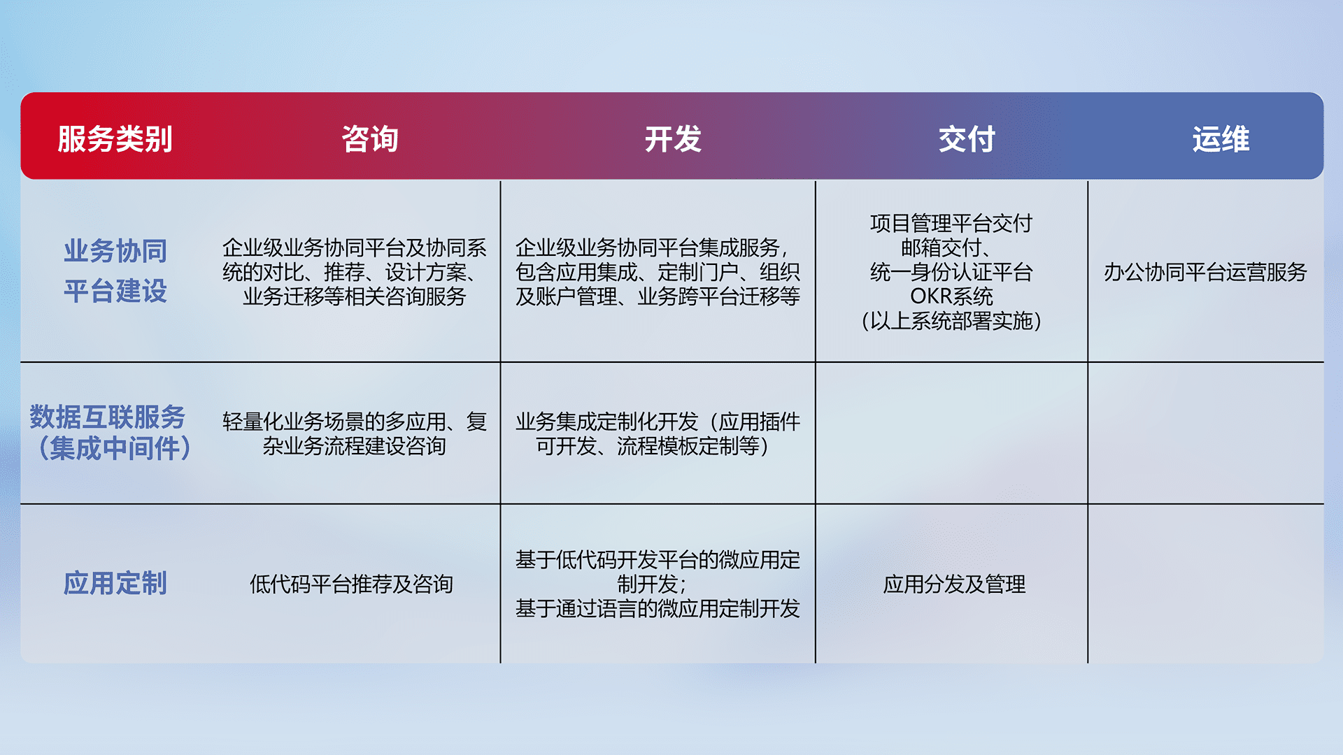 针对钉钉、、企微、、、IDaas等平台级产品提供产品的规划、、、、方案、、、交付、、定制化开发等服务,,,实现如统一协同办公、、、、智能客户服务、、、混合会议管理、、智能数据查询、、、、等业务场景,,实现数字化转型。。。